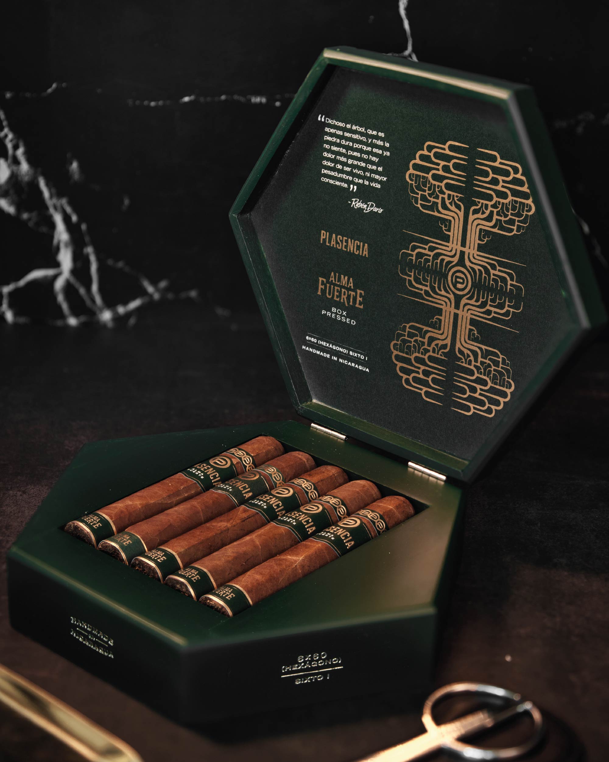 帕拉森(Plasencia)推出了新版的烈魂系列六边形(Alma Fuerte Sixto)雪茄,以六边形盒压的规格制成,突破了传统的雪茄形状。它采用了在尼加拉瓜哈拉帕种植且经过10年陈年的科罗霍多克拉罗茄衣,装在光滑的森林漆六边形盒子里,与它独特的盒压形状相呼应。